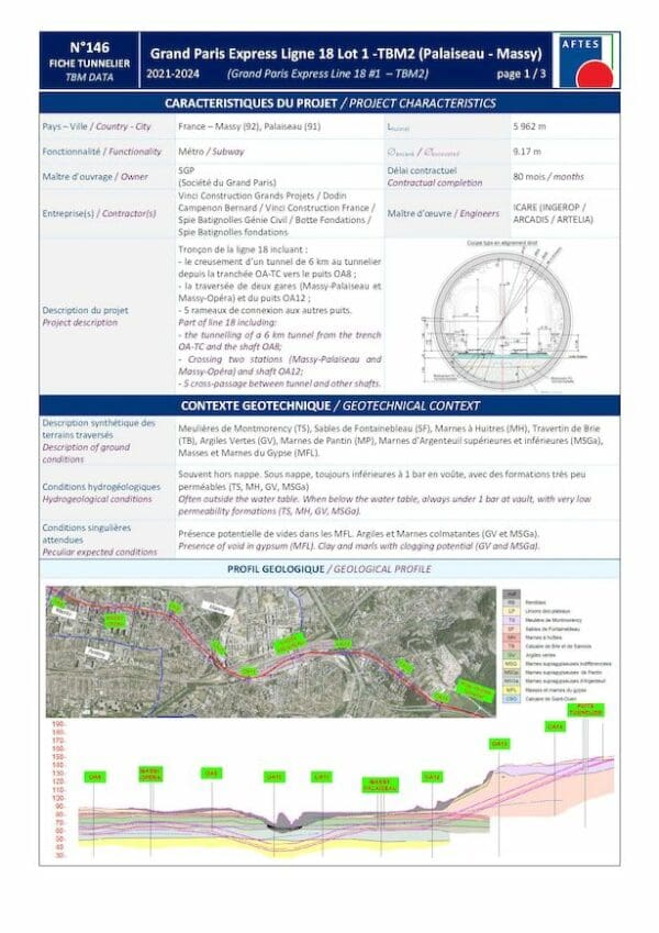 The tunnel boring sheets make it possible to understand the context of the project through its characteristics, present the geological model of the associated tunnel and detail the machine used for the excavation with its technical specificities and innovations.