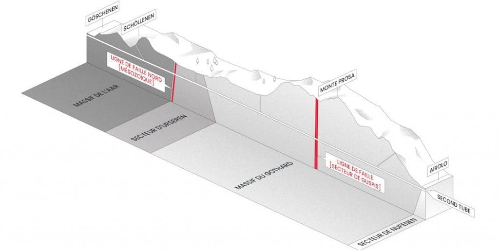En partant du nord, le tunnel traverse le massif de l’Aar, qui est principalement constitué de granites et de para-gneiss. Le tunnelier doit ensuite percer les roches mésozoïques et permo-carbonifères du secteur d’Urseren. La troisième formation est le massif du Gothard, qui est principalement composé de gneiss et de granites. Le secteur de Nufenen, près du portail d’Airolo, est constitué de méta-sédiments. Dans le secteur des portails, c’est-à-dire au niveau des entrées du tunnel, on trouve des tronçons de roche meuble de longueur variable.