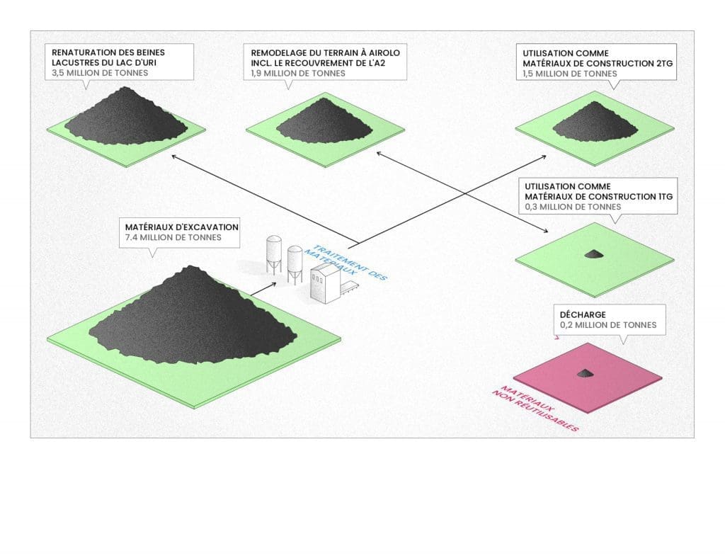 1,8 million de tonnes de matériaux d’excavation est ainsi immédiatement transformé en nouveaux matériaux de construction. Environ 1,9 millions de tonnes seront utilisées par l’OFROU pour remodeler le terrain et recouvrir l’autoroute à Airolo. Enfin, 3,5 millions de tonnes de roches serviront à la renaturation de la zone de faible profondeur du lac d’Uri.