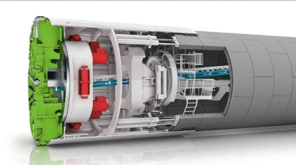 Le tunnelier est un modèle à bouclier simple TBM-S d’une longueur de bouclier de 10 mètres. Le tunnelier atteint un diamètre de 12,40 mètres. Sa vitesse de rotation de 4,6 tours par minute lui permet de progresser de 2 mètres par heure en moyenne. Le percement est réalisé par deux tunneliers, partant respectivement du nord et du sud. Une fois le percement achevé, les tunneliers – qui portent d’ailleurs traditionnellement un prénom – devront être démontés et évacués.