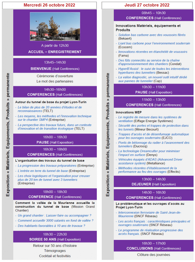 Ces journées se déclineront sous la forme de conférences (grands projets souterrains et innovations) et d’une exposition focalisée sur les matériels, équipements et produits.