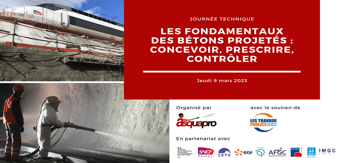 L’ASQUAPRO, avec le soutien de la Fédération Nationale des Travaux Publics et en partenariat avec le Ministère de la Transition Ecologique et de la Cohésion des Territoires, SNCF Réseau, le CETU, EDF, RATP, l’AFGC, l’AFTES le STRRES et l’IMGC organise une journée technique portant sur : Les fondamentaux des bétons projetés : concevoir, prescrire, contrôler à destination des maitrises d’œuvre
