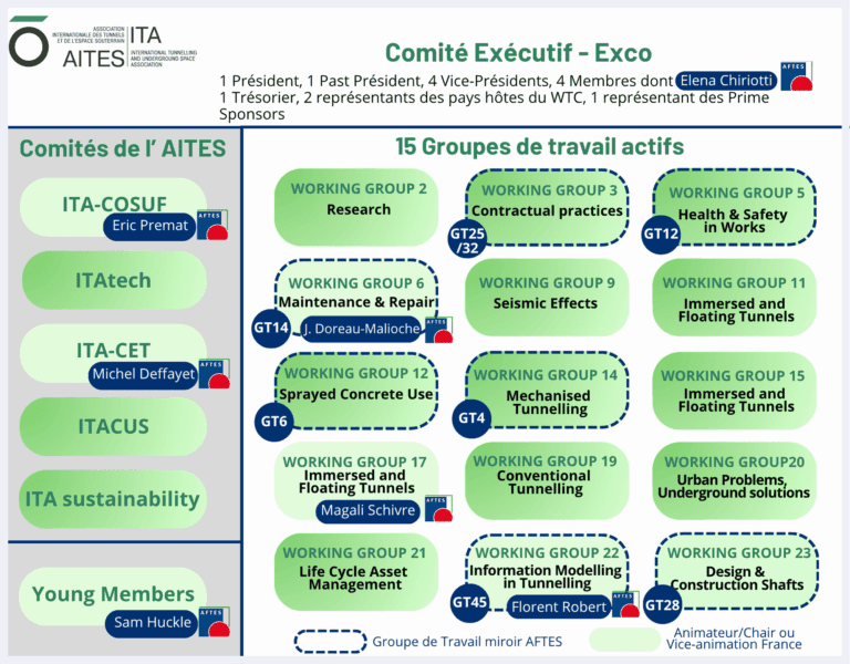 L’AFTES occupe en 2025 six postes clefs contribuant à la vie de l’ITA-AITES : Elena Chiriotti – membre du conseil Executif, Magali Schivre – animatrice du WG17 Long Tunnels at Great Depth, Florent Robert – animateur du WG22 Information Modelling In Tunnelling, Eric Premat – Président du Comité ITA COSUF, Michel Deffayet – Président de ITA Foundation et Vice-Président de ITACET (formation), et Sam Huckle – Président des Young Members.
