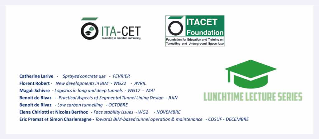 La visibilité de l’AFTES a aussi été assurée au niveau des webinaires de formation « Lunchtime Lecture Series » organisées tous les deuxièmes mardis de chaque mois par la fondation ITACET et le comité ITA-CET et souvent portées par des représentants français.