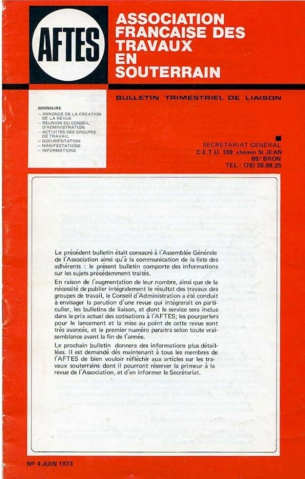 L’Association Française des Travaux en Souterrain a pris naissance le 7 Janvier 1972, au 1er Juin 1973 elle compte 290 adhérents répartis par moitié en membres collectifs et membres individuels appartenant à tous les organismes intéressés aux travaux souterrains.